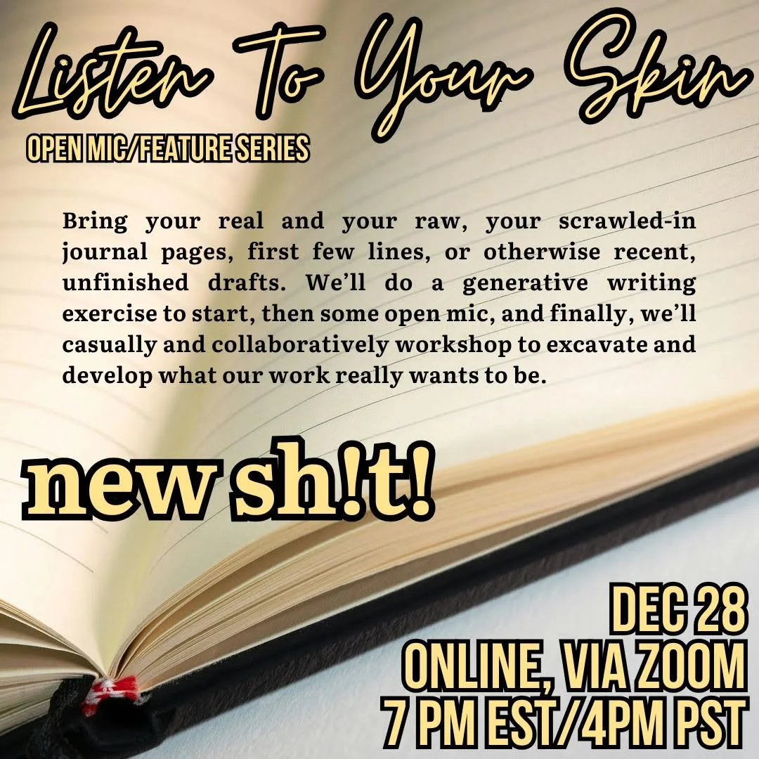 Listen to Your Skin is a monthly, literary reading series and open mic (most last Sundays). We are also a press, specializing in multi-genre anthologies on special topics (erotica and religious trauma, so far) and our first poetry title is forthcoming, March ‘26.